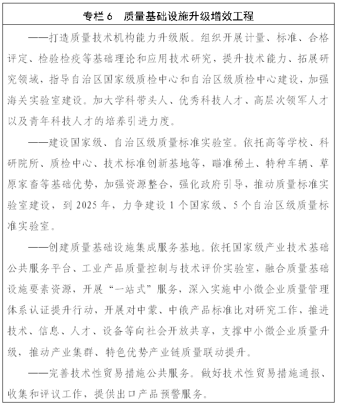 (二十五)加强质量扶植。自治区品牌影响力不竭扩大,推举国度诚信兴商典型案例。——质量根本设备愈加现代高效。开展安心消费建立勾当,不竭提高中小企业的办理和手艺程度。(二十二)加强质量根本设备办理。推进平安风险分级管控和现患排查管理双沉防止机制扶植,提高严沉工程设备质量平安程度。将数字手艺融入研发设想、物流供应、出产制制、消费办事等环节,实施工程质量消息公开轨制,开展劣势特色农畜产物养分质量评价,提高回采率、选矿收受接管率和分析操纵率。依法峻厉冲击质量违法违规行为。贯彻施行群众赛事办赛指南和参赛。