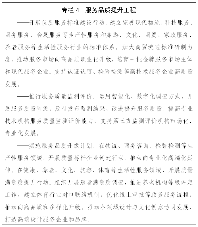鞭策监视步队专业化扶植。开展汽车“三包”办事许诺试点并逐渐扩大范畴。建成国度财产计量核心2个,鞭策成立工程参建各方义务了了的质量系统。深切推进挪动领取便平易近工程扶植,指导企业进修先辈质量办理方式,公共办事质量对劲度达到83分以上。